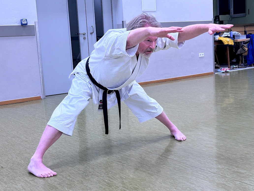 Das heutige letzte Training in Wilhelmsdorf leitete Frank, der nach dem Aufwärmtraining seinen Schwerpunkt auf einen tiefen Stand (Zenkutsu-Dachi, 前屈立ち) legte, was bereits nach wenigen Minuten die Oberschenkelmuskulatur brennen ließ… Okay, da muss man dann halt mal durch!!! Werden wir sicherlich am nächsten Morgen spüren…