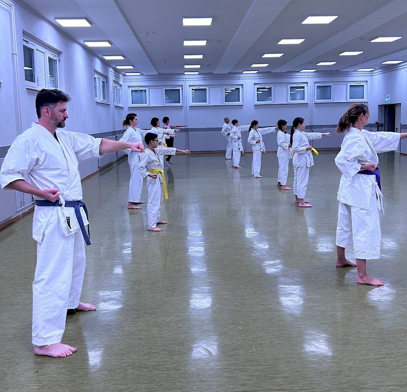 Später liefen wir noch ein paar Mal die Kata Heian Shodan (平安初段), um zusammen als Gruppe – egal, welche Gürtelfarbe – das Trainingsjahr 2026 zu beenden.