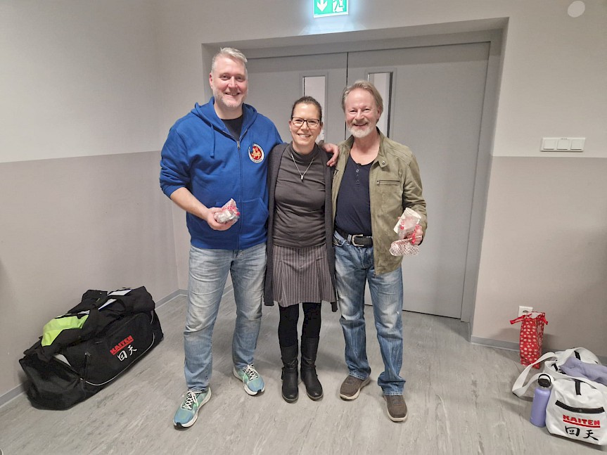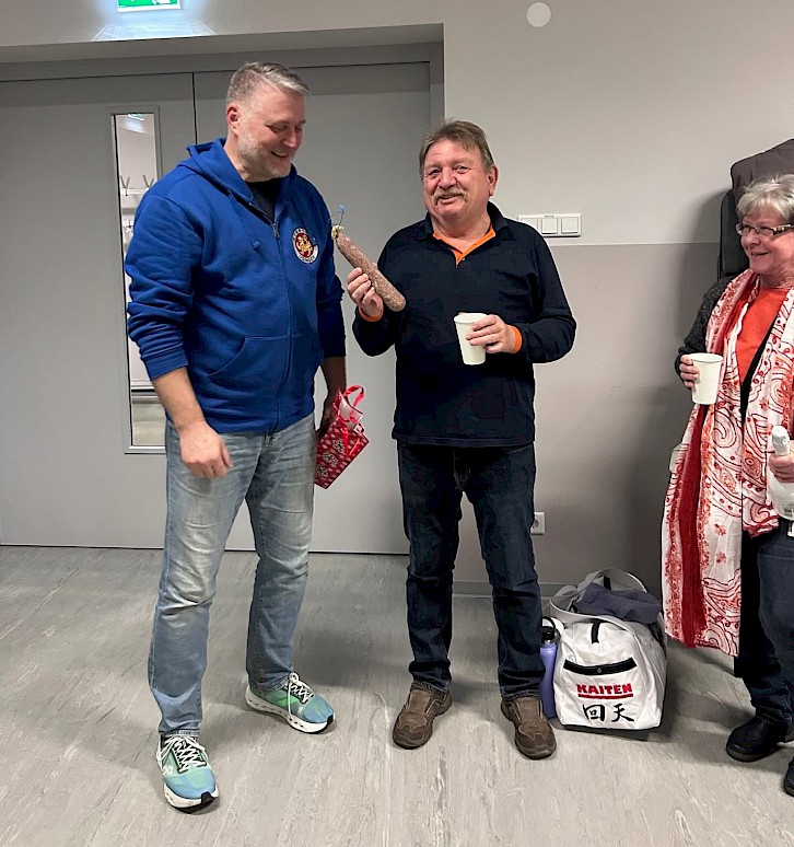 Auf diesem Wege möchte sich das Karate-Dojo Usingen e.V. nicht nur von der Halle im Bürgerhaus Wilhelmsdorf verabschieden, sondern auch von Herrn Knöpp und seiner Ehefrau, die uns als Hausmeisterehepaar stets hilfreich und freundlich zur Seite standen. Wir übergaben Herrn Knöpp und seiner Frau noch eine Flasche Sekt und eine nordhessische Ahle Wurscht zum Abschied. Nochmals ganz herzlichen Dank und weiterhin alles Gute und beste Gesundheit!